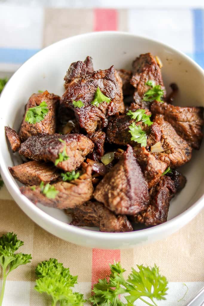 La viande de bœuf marinée et frite est servie avec du riz ou des pois, et se déguste avec un accompagnement de pikliz.